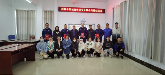 随后,双方举行了桂林学院校园消防安全辅导员聘任仪式。桂林学院李久华、周杰、付健及教师代表依次为雁山区消防救援大队唐雨翔、刘章颖、韩攀攀、唐浩颁发桂林学院校园消防安全辅导员聘书。