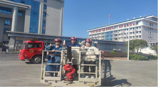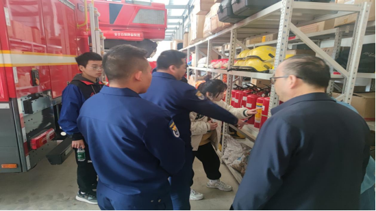 活动最后,在消防员的带领下大家走进消防站,认真讲解了消防车的用途、特点及各种随车器材的主要用途和使用方法。学生代表们戴上消防头盔,在消防员的带领下上到云梯,并近距离感受消防员工作场面。