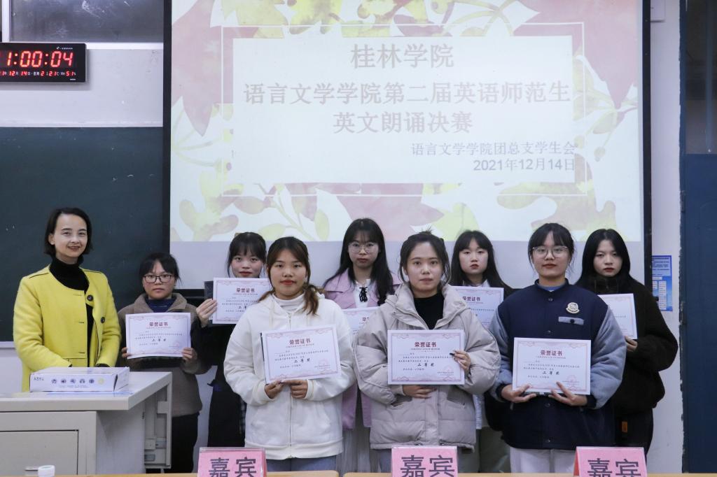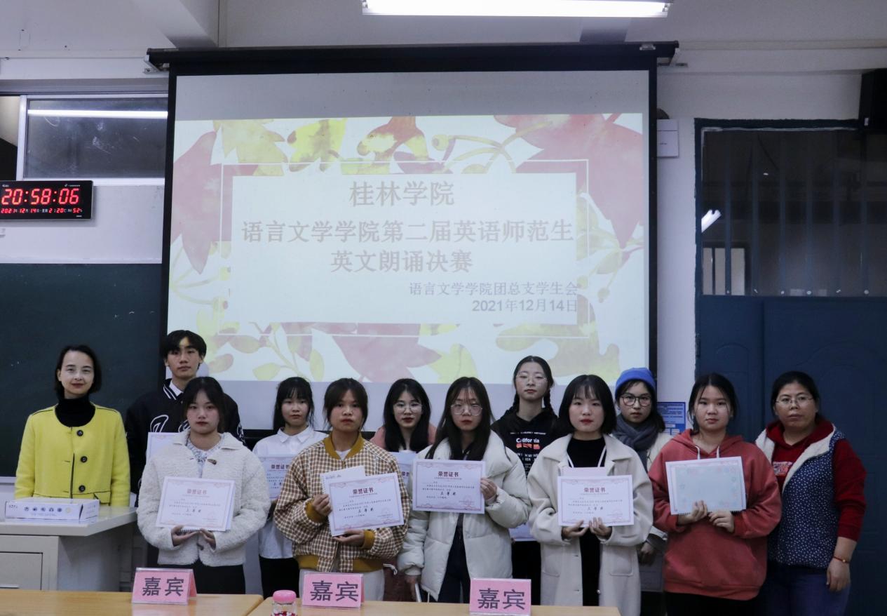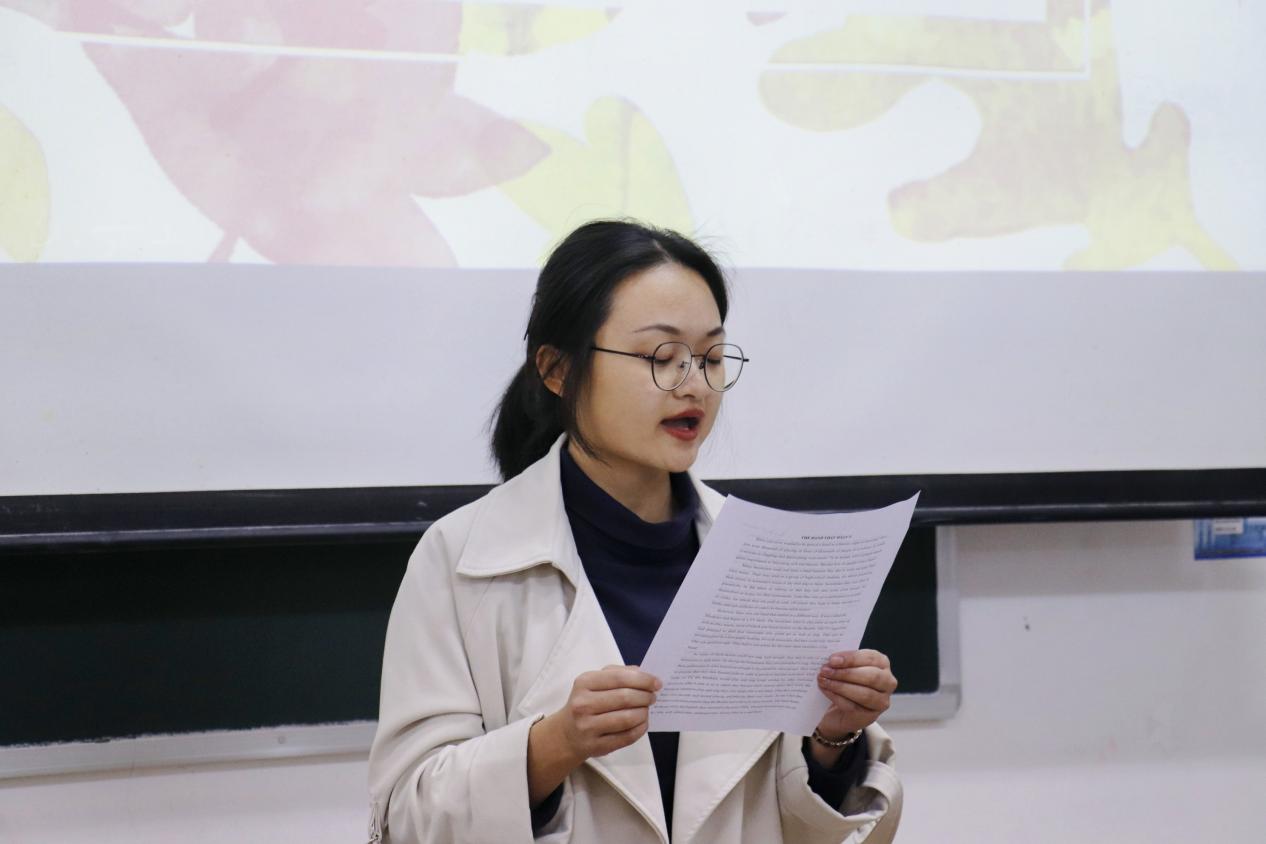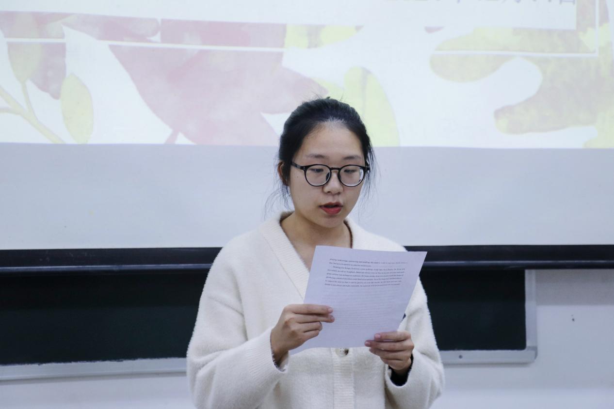为了进一步活跃校园文化气氛,丰富同学们的课余生活,激发同学们学习英语的热情,提高英语专业同学们的英语口语水平和个人朗诵能力,12月14日,语言文学学院在至善楼1303教室举办了第二届英语师范生英文朗诵大赛。本次比赛由语言文学学院陆海峡老师、欧炼芬老师以及2018级韦珍妮同学担任评委,刘秋雨、郁长远两位同学担任主持人。