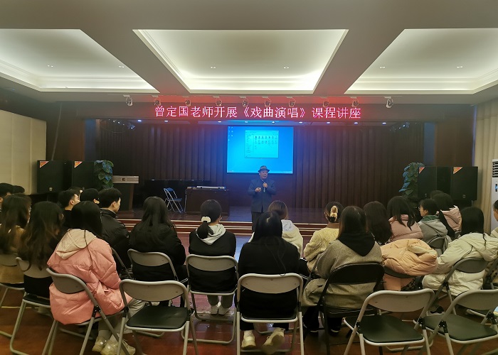 12月20日,教育与音乐学院邀请国家一级演员,原广西戏剧家协会副主席,桂林市戏剧家协会主席,原桂林市桂剧团副团长、桂林市彩调剧团团长曾定国老师在音乐演艺厅给19级音乐教育的学生开展《戏曲演唱》的课程讲座。