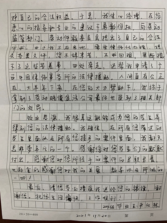 据严仕林表示,2020年春节之后,因为疫情的原因无法如期回到任职的公司上班,被公司非法辞退。江仿书记得知情况后,主动给予学生法律专业援助,并利用社会力量帮助学生维护自己的合法权益。在江仿书记的悉心指导和专业帮助下,严仕林信心倍增,顺利走上维权之路。他在无法提交各类文件的情况下,江仿书记不辞辛苦、不求回报揽下了这件“苦差事”,为自己四处奔走,最终成功维权。