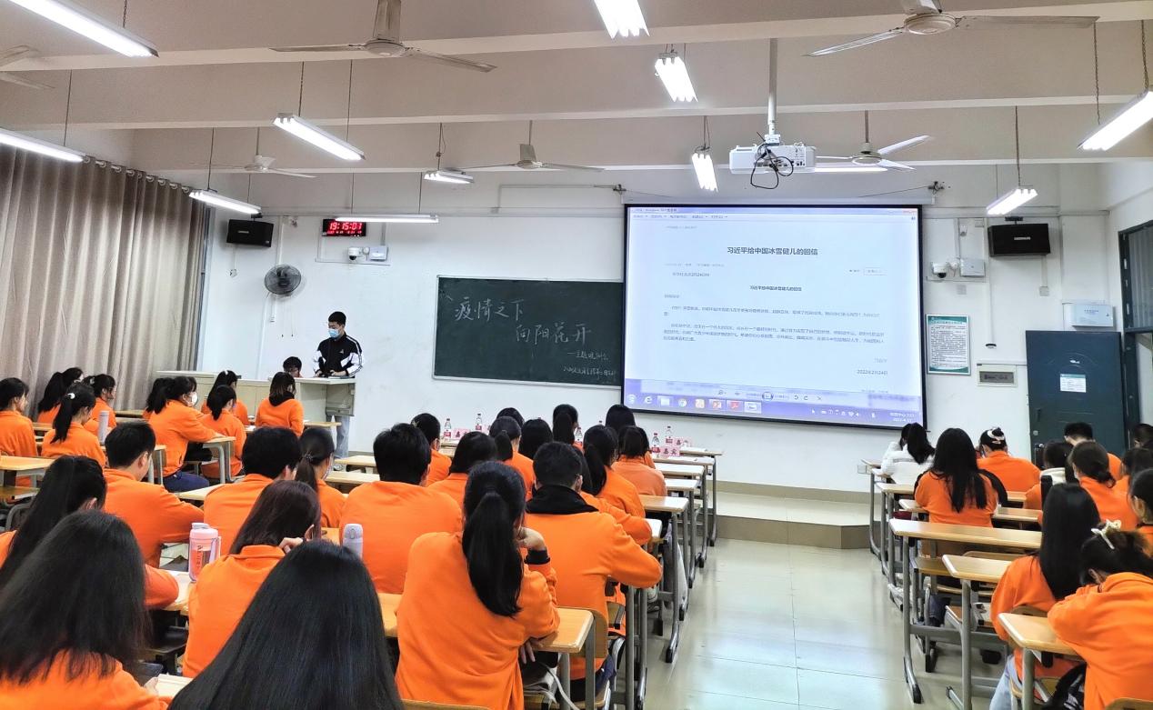 此次班会围绕着习近平总书记给中国单板滑雪运动员苏翊鸣的回信展开。本届冬奥会上,中国体育代表团取得我国参加冬奥会的历史最好成绩,为祖国和人民赢得了荣誉。正如习近平总书记所说:“新时代是追梦者的时代,也是广大青少年成就梦想的时代。希望你们心系祖国,志存高远,脚踏实地,在奋斗中创造精彩人生,为祖国和人民贡献青春和力量。”这既是对冰雪运动员的希望,也是对青年一代的寄语。同学们看完回信后热血澎湃,各抒己见。我们作为新时代的青年,要牢记习近平总书记的嘱托,不负青春、不负使命、不负出生在这个伟大的国家,成长在这个最好的时代,以中国冰雪健儿为榜样,奋勇拼搏和超越自我,唱响为国争光的青春赞歌。