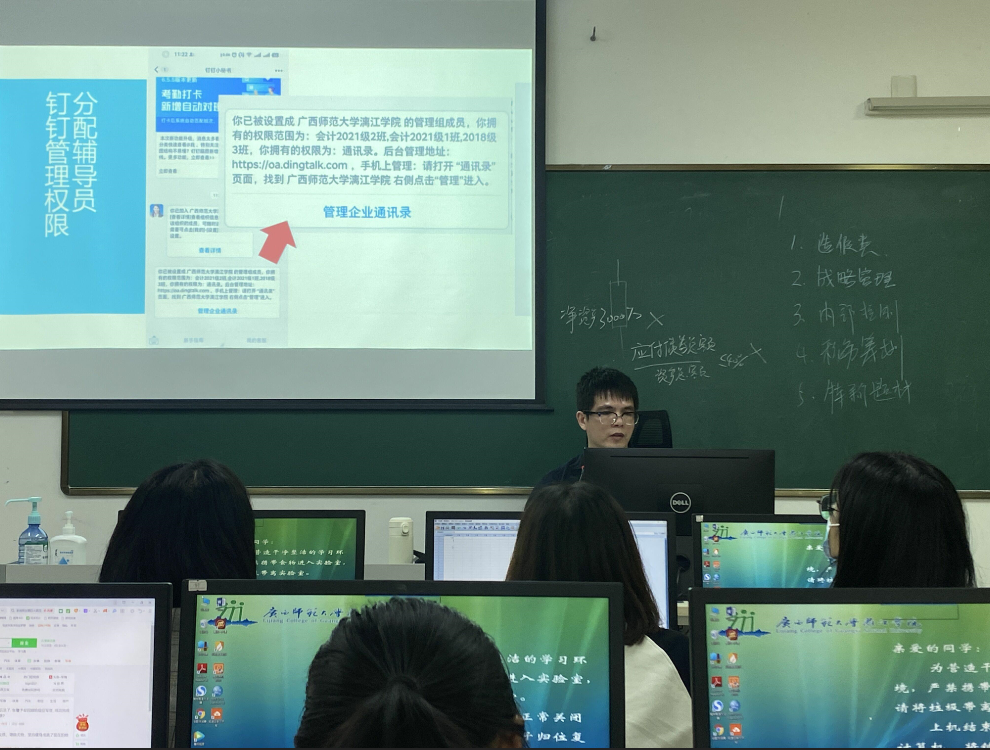 为推进学校创建“广西绿色学校”工作,加深加强学校钉钉平台的应用,提升学生管理效能,5月17日下午,实验教学与网络信息中心联合学生事务部在至善楼3407机房举行校园智能化管理培训会,王健老师为全体辅导员作培训。