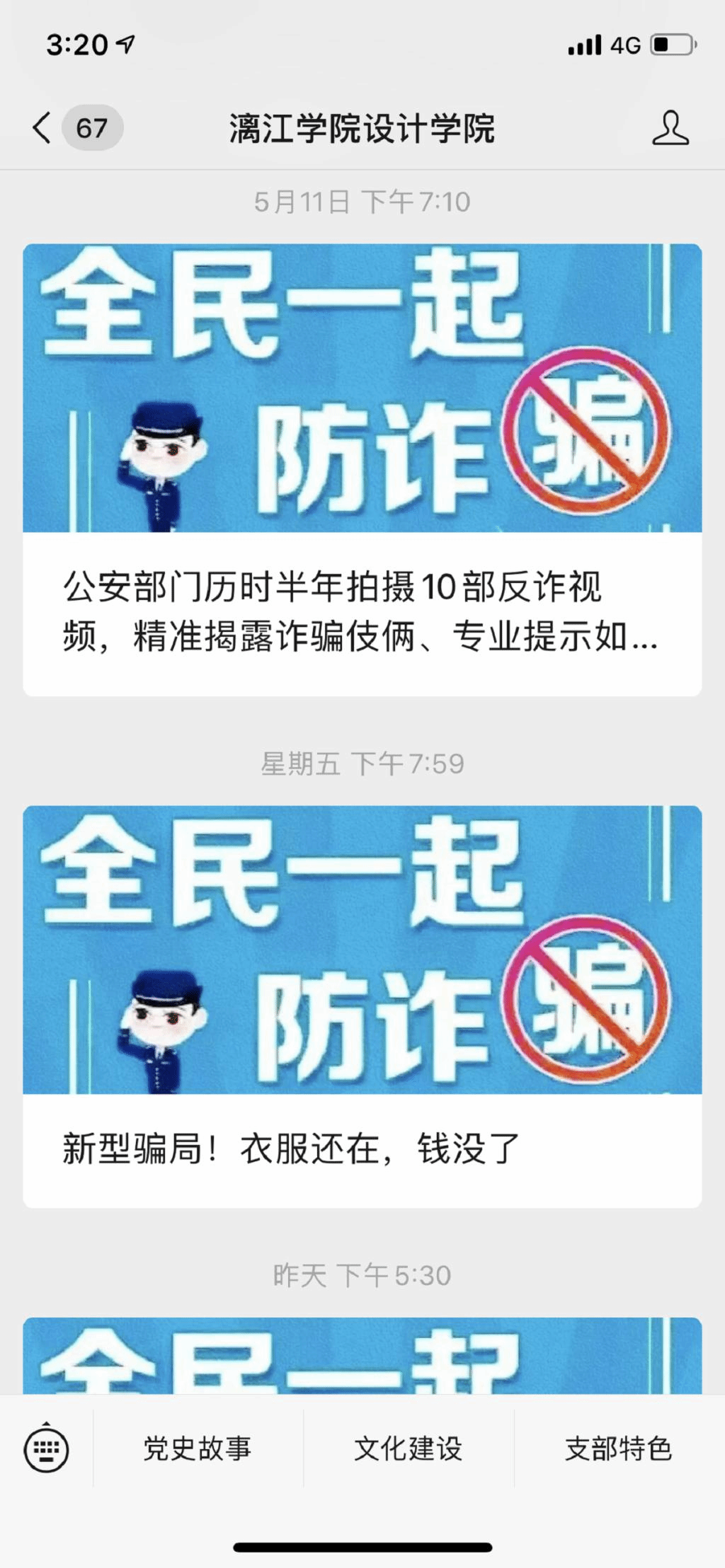充分利用班级QQ群、微信群、微信公众号等平台定期发送反诈骗信息,帮助学生及时了解诈骗新方法、新形式。截至目前,微信公众号一周一期共推出四期反诈骗文章,营造浓厚的反诈骗氛围。