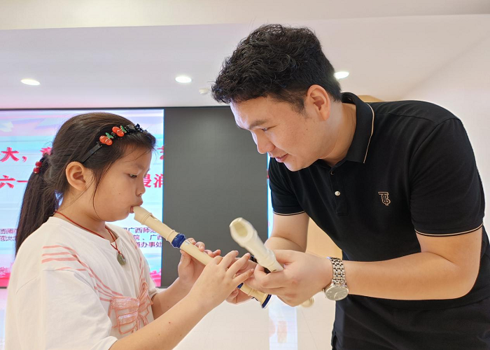 表演结束之后,两所高校的老师现场组织小朋友进行口风琴和竖笛的教学,老师教学得法,小朋友学习认真,不大一会就能吹奏出简单的旋律。