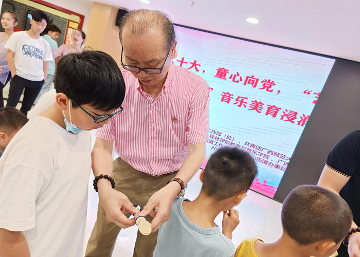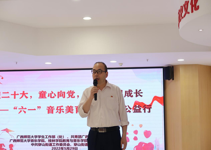 为了庆祝“六一”儿童节,喜迎党的二十大召开,“六一”前夕,教育与音乐学院联合广西师范大学音乐学院、广西期刊传媒集团来到桂林市穿山街道,为当地儿童捐赠了多姿多彩的儿童节礼物,还为社区少年儿童及家长献上了一台文艺表演。活动受到了穿山街道干部群众以及小朋友和家长的热烈欢迎。