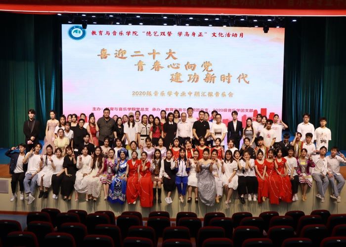 5月30日,教育与音乐学院“德艺双馨 学高身正”文化活动月之“喜迎二十大 青春心向党 建功新时代”2020级音乐学专业中期汇报音乐会在弘善讲堂举行,教育与音乐学院院长彭超、党总支书记周杰、副院长江帆、党总支副书记熊云云、班级导师及音乐学专业教研室、舞蹈学专业教研室、团总支教师代表观看了演出。