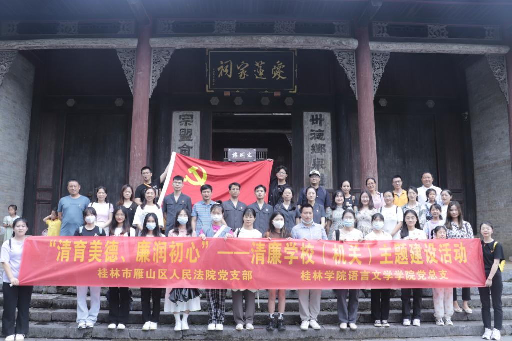 为进一步营造廉洁文化宣传教育的浓厚氛围,弘扬崇廉尚洁的价值观念,推动我校廉政文化建设。6月13日桂林学院语言文学学院党总支与桂林市雁山区人民法院党支部共同前往桂林市灵川县九屋镇江头村开展“清廉美德、廉润初心”——清廉学校(机关)主题建设活动。