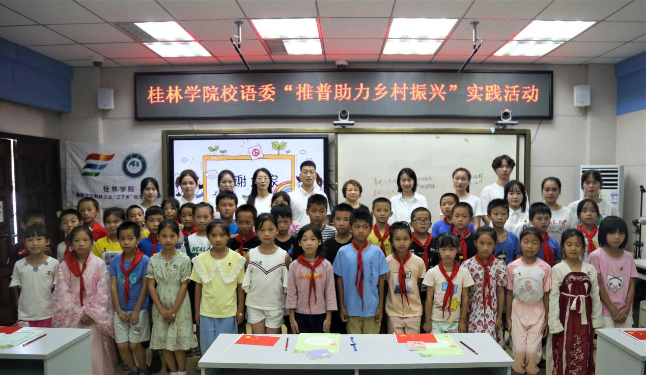为深入贯彻习近平总书记关于教育的重要论述和关于语言文字工作的重要指示批示精神,加强民族地区农村地区国家通用语言文字推广力度,不断提高普通话普及率和普及水平,以实际行动迎接党的二十大胜利召开。7月6日下午,学校语言文字工作委员会组织赴桂林市大埠中心校开展2022年“推普助力乡村振兴”暑期“三下乡”社会实践志愿服务活动。校语委指导老师邓克鹏、何一亿以及校语委学生干部参加本次活动。