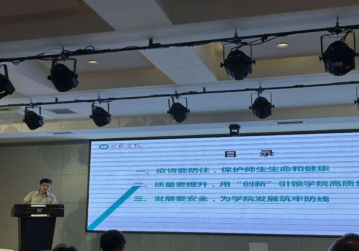 江仿书记作“疫情要防住、质量要提升、发展要安全” 主题发言。江书记强调,要防住疫情,保护师生生命和健康;以就业为导向提升教育教学质量,用创新引领学院高质量发展;最后,江书记表示发展要注重安全,为学院高质量发展筑牢防线。会上江书记还通报了学校2022年发展与改革暑期研讨会的会议内容。