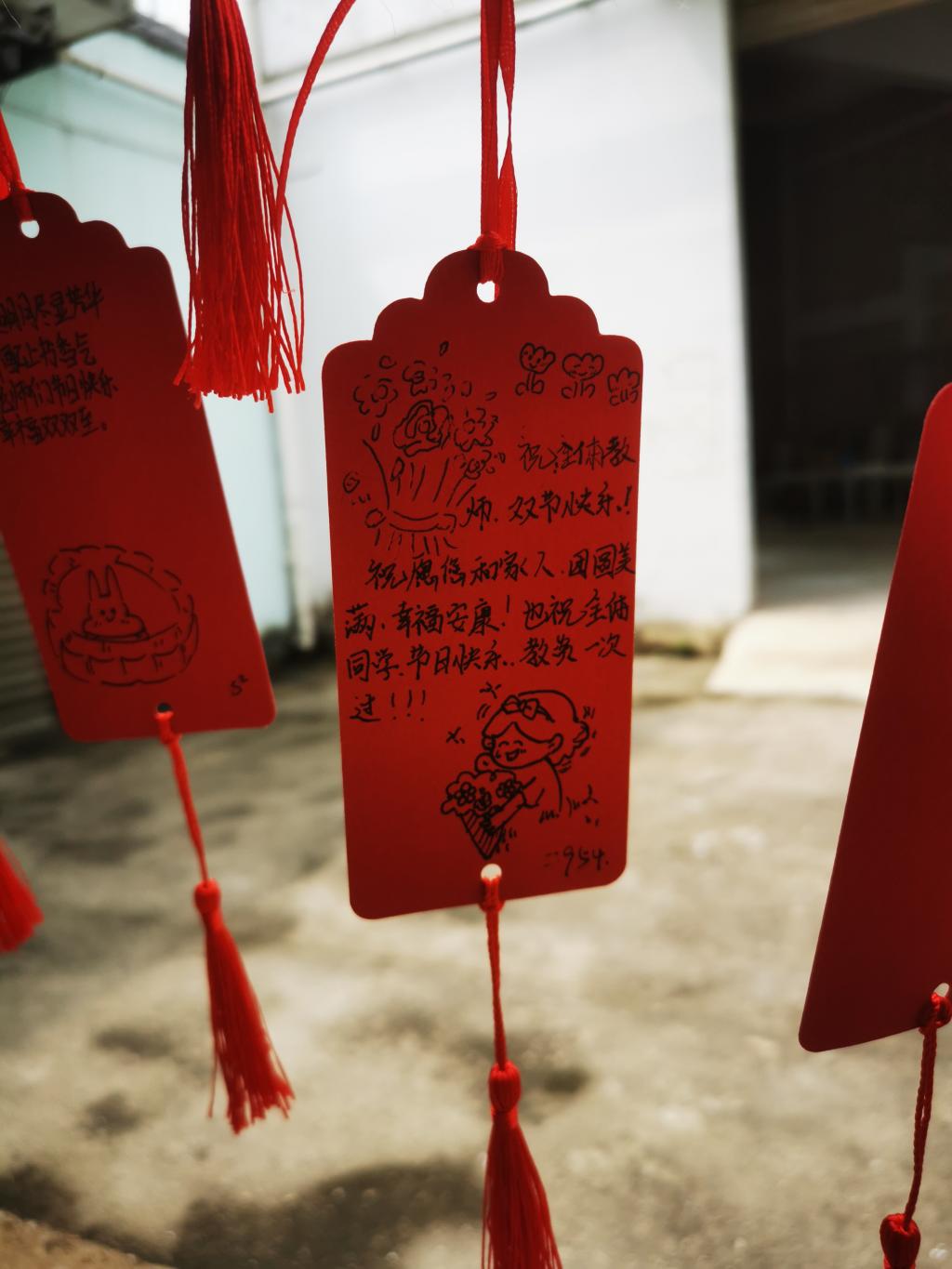 活动开始,主持人向大家介绍了教师节的由来,邀请同学们手写祝福吊牌表达对老师的感激之情。同学们聚精会神,将千言万语凝成祝福几句,赠与朝夕相处,传道解惑的老师。随后,团总支工作人员收集好同学们的祝福吊牌前往学院“廉洁文化”走廊,将祝福系在灯笼上,串在红线上,一只只精巧美观的灯笼,一张张充满祝福的吊牌,让整个“廉洁文化”走廊透露着浓浓的节日气息。小小的吊牌,是祝福,是感谢,更是心与心的连结。