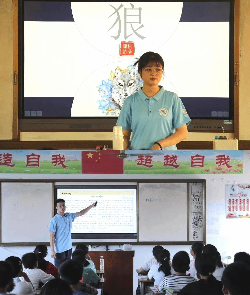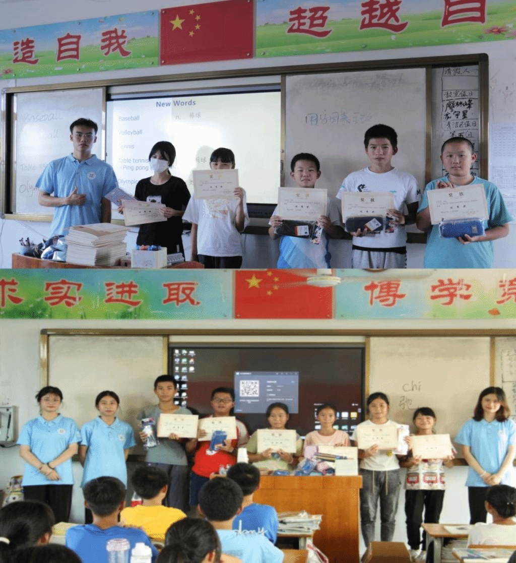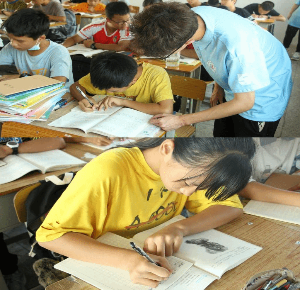 大学生步入初中课堂,与所在班级学生进行实践教学,学院学生代表徐安瑜和阳霖辅同学分别担任该校初一年级一班和二班的助教老师。在教学互动环节中,两位主讲人提问学生,学生们积极举手回答问题,产生了浓厚的学习氛围。在汉字和英文书写教学环节中,对所在班级学生进行书写教导,矫正学生写字的不良习惯,帮助他们理解书写的正确方式。最后在评比“优秀书写者”环节结束课堂教学活动,对所带班级学生的课堂书写表现评选出前二十名优秀同学,给他们颁发证书和奖品。