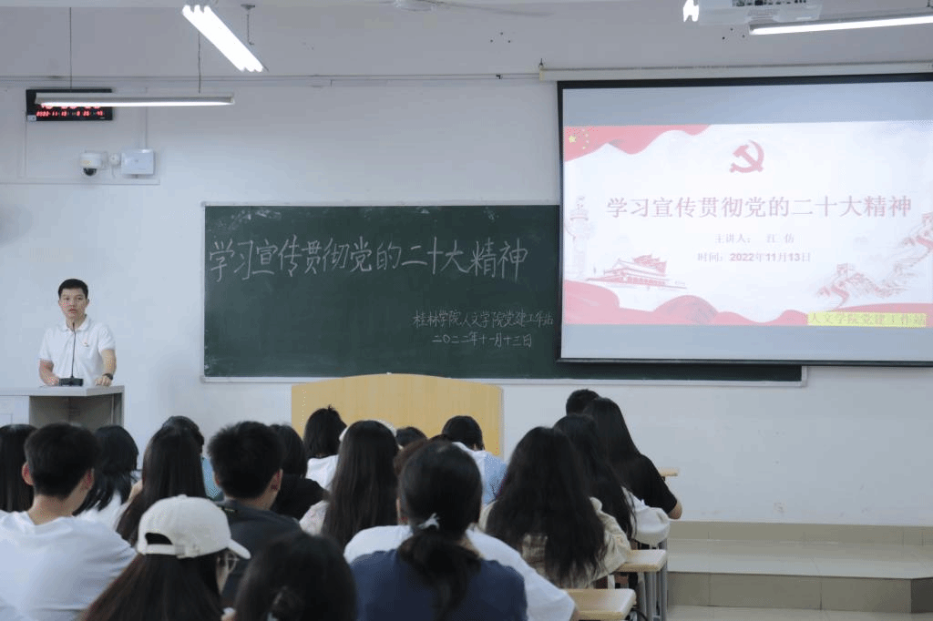 人文学院党总支学习宣传贯彻党的二十大精神宣讲活动11月13日在1317教室举行。人文学院党总支书记江仿为学院全体入党积极分子进行了党的二十大精神的宣讲。