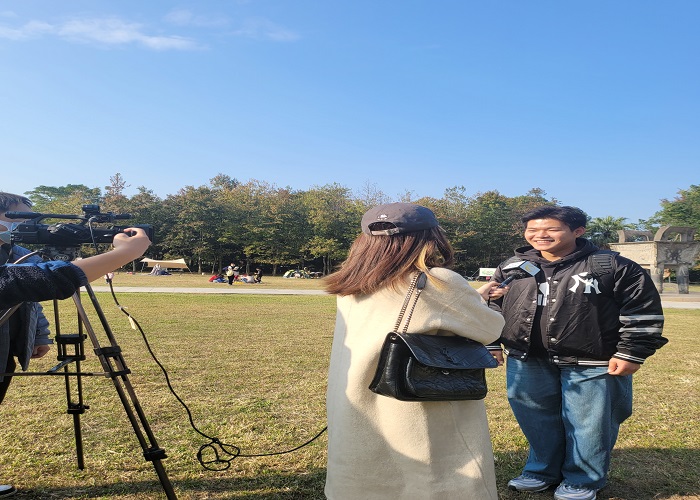 学生们来到帐篷营地的微剧场,其剧场项目——《城市的颜色》以露营帐篷为演出场域,共有五间不同的剧场。观演中,两名学生受邀参与《沙发》诙谐戏剧即兴演出,同学们与戏剧演员配合默契,获得了现场观众热烈的欢呼声和掌声。虽是临时受邀,但他们毫不怯场,即兴的演出大大提高了学生们在真实情境中的主动性和创造性。在桂林东西巷戏剧街头巡游中,同学们分别融入到街头巡游《太空牛在地球》、木偶互动巡游《那个小孩》和《手提剧场:做翅膀的人》等剧目中,与演员们互动,近距离接触艺术装置,亲生体验艺术的力量。结束后,桂林电视台记者还对参演学生进行了专题采访。