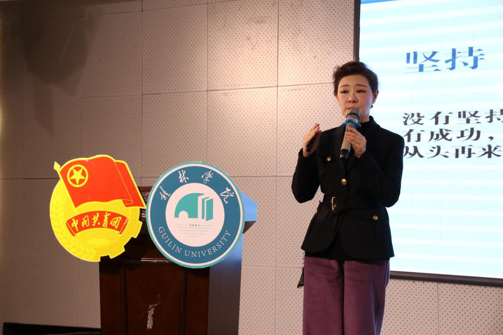 11月8日下午,我校工会与校团委在至善讲堂联合开展了“劳模工匠进校园”活动,邀请了广西三八红旗手、桂林市第五、六届政协委员、“桂林工匠”李珺到校为师生作专题讲座,党政事务部、学生事务部相关负责人,校团委全体老师以及各二级学院团总支书记、学生代表等参加活动。