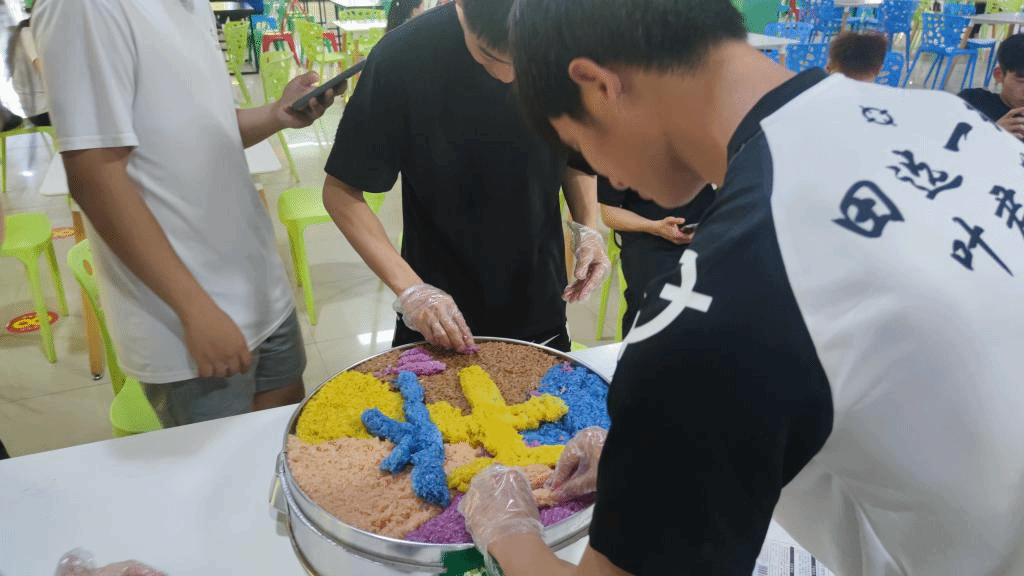 活动当天,参加活动的人员在乐善食府二楼集合,由壮族学生代表向各分组成员介绍“三月三”节日的由来和相关的民俗。随后,同学们纷纷开始学习壮族美食“五色糯米”和“青糍粑”的制作,等到糯米饭和糍粑蒸熟以后,同学们分工明确,对糯米饭进行了摆盘装饰,亲口尝试了自制美食。