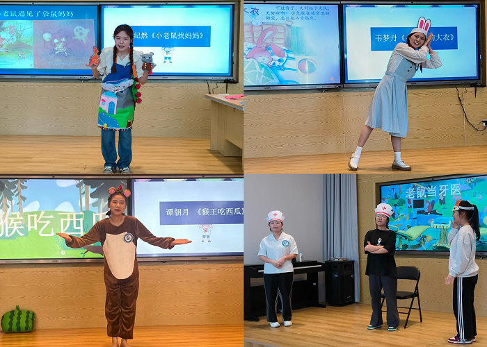 决赛正式开始。个人选手、团体选手依次进行故事讲述。选手们的表演生动形象、声情并茂。她们用丰富的面部表情、灵活的肢体动作和搭配上自己动手制作的精美教具,惟妙惟肖地将一个个的幼儿故事讲述得津津有味,展现出教育学院学前学子活泼自信的风采。