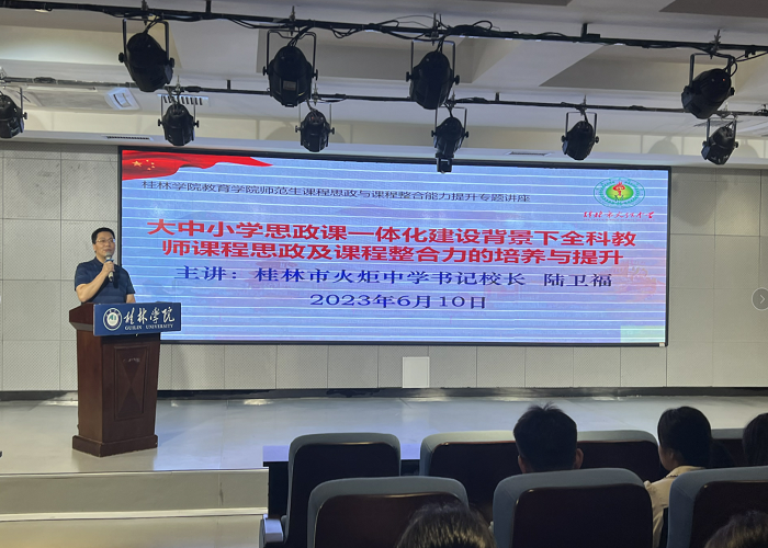 为提高我校教师课程思政能力,帮助学生了解大中小学思政课一体化的背景、意义及其内涵等,6月10日,教育学院邀请桂林市中小学思政课一体化建设专家指导组副组长、桂林火炬中学校长陆卫福,面向小学教育师生开展以《大中小学思政课一体化建设背景下全科教师课程思政及课程整合力的培养与提升》为主题的讲座。