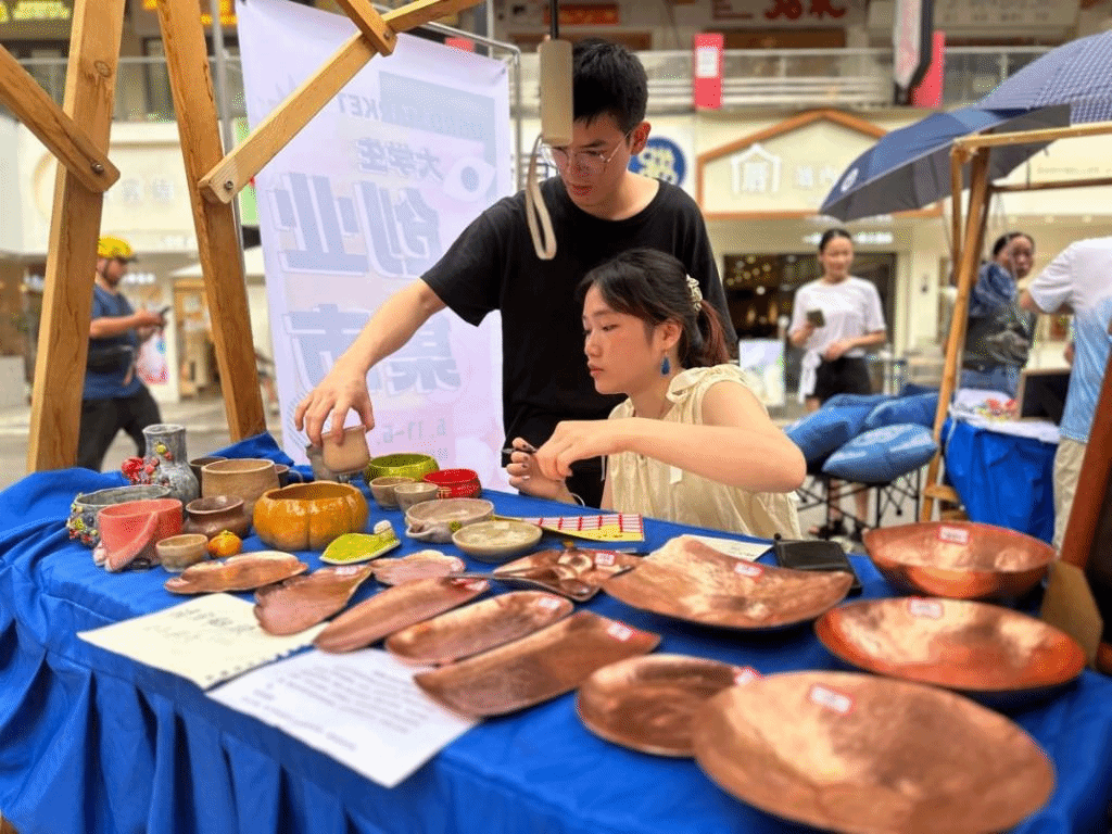 在两天的创业集市活动中,同学们的摊铺在高新万达商业广场室外活动中心一字排开,十分醒目,摊铺上的创意产品的种类丰富,包括木雕、陶瓷、金属、扎染、漆画、编织、掐丝饰品、手绘扇子等等。这些展销产品均城市设计学院工艺美术专业学生原创作品,产品创意十足,制作精美,吸引了大量市民驻足、选购。