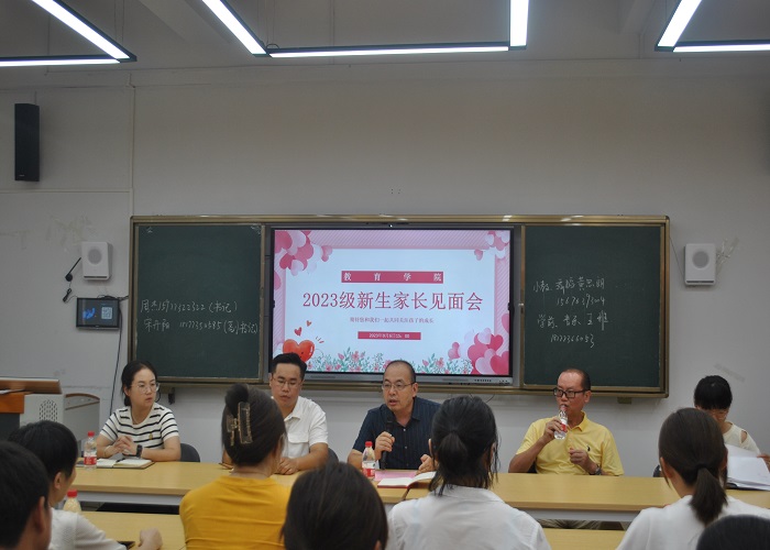 为促进家校合作,增进新生家长对大学生活和专业的了解,共同帮助学生健康成长,教育学院于9月6日在嘉善楼6242教室成功召开了2023级新生家长见面会。本次会议由党总支副书记宋丹阳主持,教育学院院长彭超,党总支书记周杰,相关专业辅导员以及近70名学生家长参会。