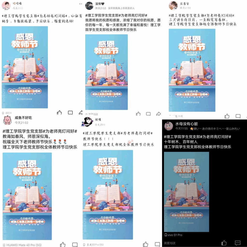 学生党支部发起网络留言送祝福活动,把学生党员对老师的谢意以文字和海报的形式在网络平台进行传播,引领周围的同学感念师恩,尊敬师长。