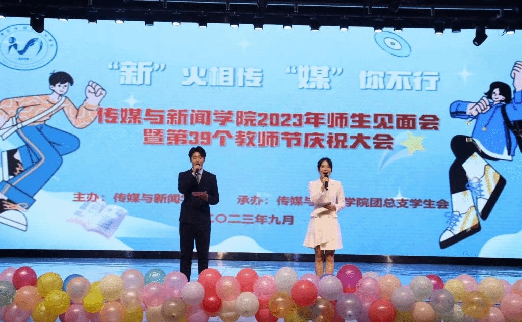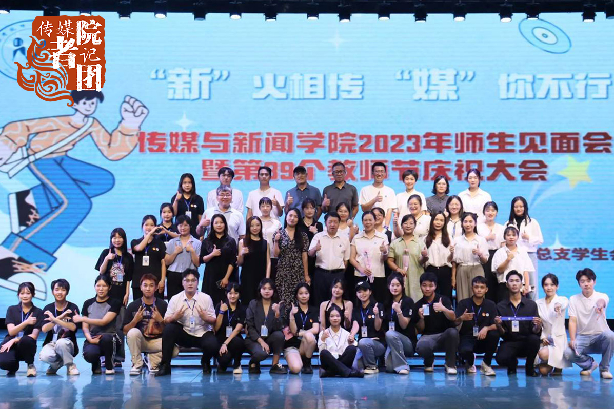 9月10日下午,传媒与新闻学院以“‘新’火相传,‘媒’你不行”为主题,在弘善讲堂举办了2023年师生见面会暨第39个教师节庆祝大会。学生事务处(部)副部(处)长刘雪应邀参加,传媒与新闻学院全体教职工和288名2023级新生参加大会。大会还以直播方式邀请家长“云”相见。