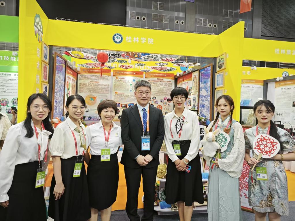 我校学前教育专业是广西民办高校优势特色专业和学校一流专业,学前教育专业结合办学定位及专业特色,依托自治区级课程思政示范课程《幼儿园手工制作》,精心策划筹备了“培根铸魂育新人,启智润心担使命”为主题的专业教育展示。展出了以传统手工艺、自制教玩具为主的学前教育专业美术类课程以及多门专业课程联合教学的实践作品,充分展示了学前教育专业技术技能服务和应用于幼儿教育、现代生活的成果。期间,联合国教科文组织曼谷多部门地区办事处代理主任汪利兵、自治区教育厅厅长刘友谊等领导嘉宾,来自印尼、马来西亚、新加坡、菲律宾、泰国等东盟国家高校的嘉宾,以及广西各兄弟院校领导来到设在广西建设职业技术学院体育馆的桂林学院技术技能服务现代生活展位观展和指导。精美的剪纸、刻纸、衍纸、竹编、脸谱、醒狮等极具中华优秀传统文化及民族文化特色的作品吸引了诸多外宾驻足欣赏和参与体验。杨树喆、杨庆庆,看望参加联展活动的全体师生,并观看了我校舞蹈学专业师生创作的《漓江春早》舞台展演。