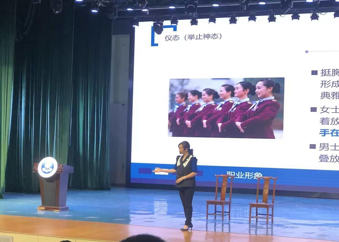 接着,冯凯琦老师邀请同学上台示范,向同学们展示如何使自身的体态更加美观,“站如松,坐如钟”。站时抬头挺胸可以显现出自信,坐时腰背挺直可以显得端庄大方,凸显出自身的气质。观众席的同学们也根据冯老师的示范,调整自身的坐姿。
