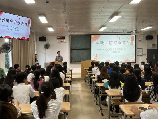 9月24日下午,人文学院党总支书记、副院长庞一飞来到2023级汉语言文学专业的周末晚例会现场,与同学们同上“中秋国庆节前安全教育”主题班会。