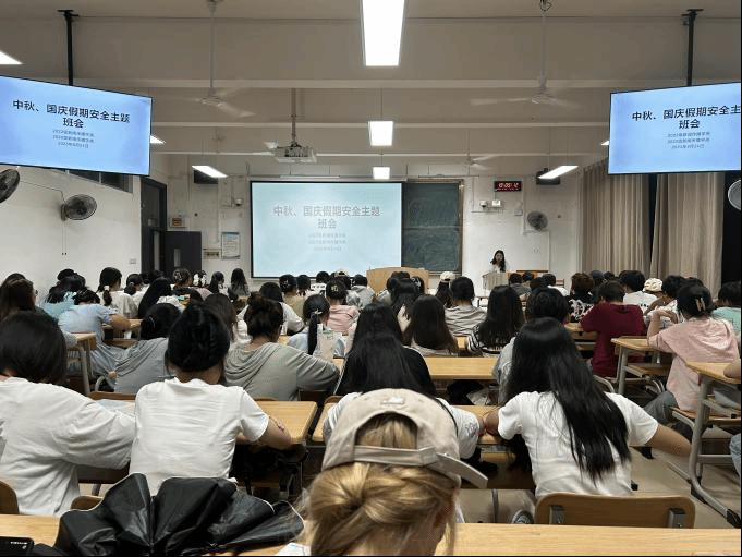 班会上,各年级专业辅导员向学生强调假期期间宿舍安全、防范网络电信诈骗、个人财物、饮食卫生、防火、交通、防溺水、防洪水、防山体滑坡及落石等方面的安全注意事项。教育并引导学生遵纪守法、增强法制观念,重点强调了外出期间的交通安全、人身财物安全以及食品卫生安全等。除此之外,严格落实离校报备或请假审批手续,切实做好每名离校外出学生的去向登记及外出期间的轨迹管理期间。2021级广播电视编导专业辅导员陈虹提醒同学们在国庆假期期间应适度娱乐,避免沉迷,控制上网时间、限定上网内容、预防电信诈骗。2022级新闻传播学类辅导员曹依婷提到在国庆假期期间同学们要谨记防溺水“六不”,远离危险水域。2023级新生辅导员李晓蕾、王佳雨强调用电安全、交通安全等方面,并叮嘱新生认真学习《学生手册》,增强纪律意识,严守校纪校规。