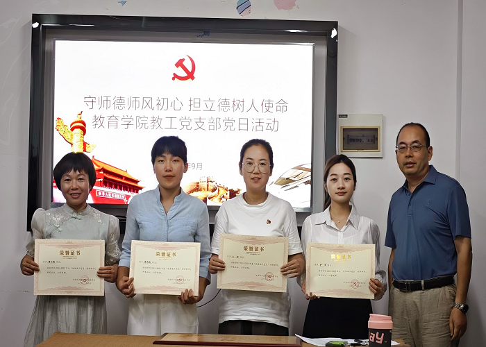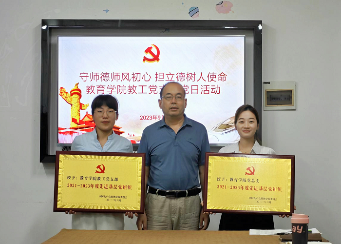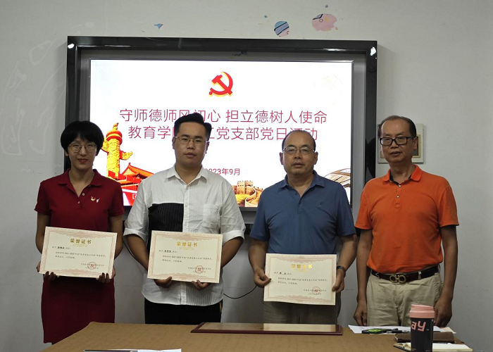 随后,根据《关于做好我校2021-2023年度优秀共产党员、优秀党务工作者和先进基层党组织评选推荐工作的通知》文件要求,对获奖单位和同志颁发了证书。教育学院党总支和教工党支部分别获评学校2021-2023先进基层党组织单位,4名教职工获优秀党务工作者称号,8名师生党员获优秀共产党员称号。