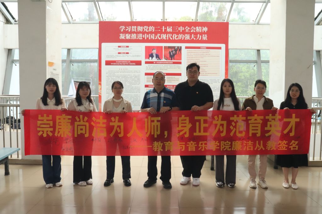 为加强作风建设,在2025年“5.10”思廉日来临之际,教育与音乐学院组织开展“崇廉尚洁为人师 身正为范育英才”签名活动,教育与音乐学院党总支书记、主持行政工作副院长出席。