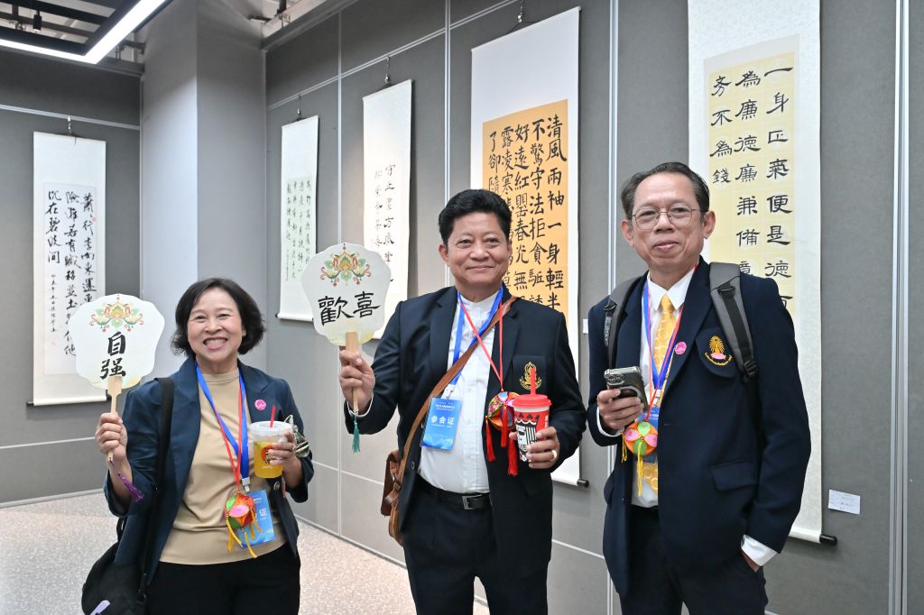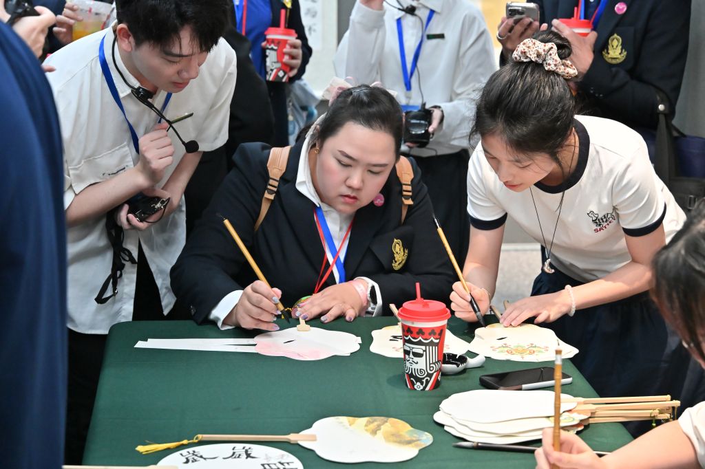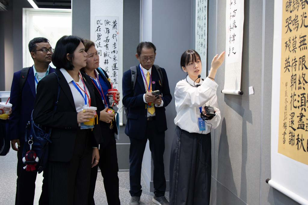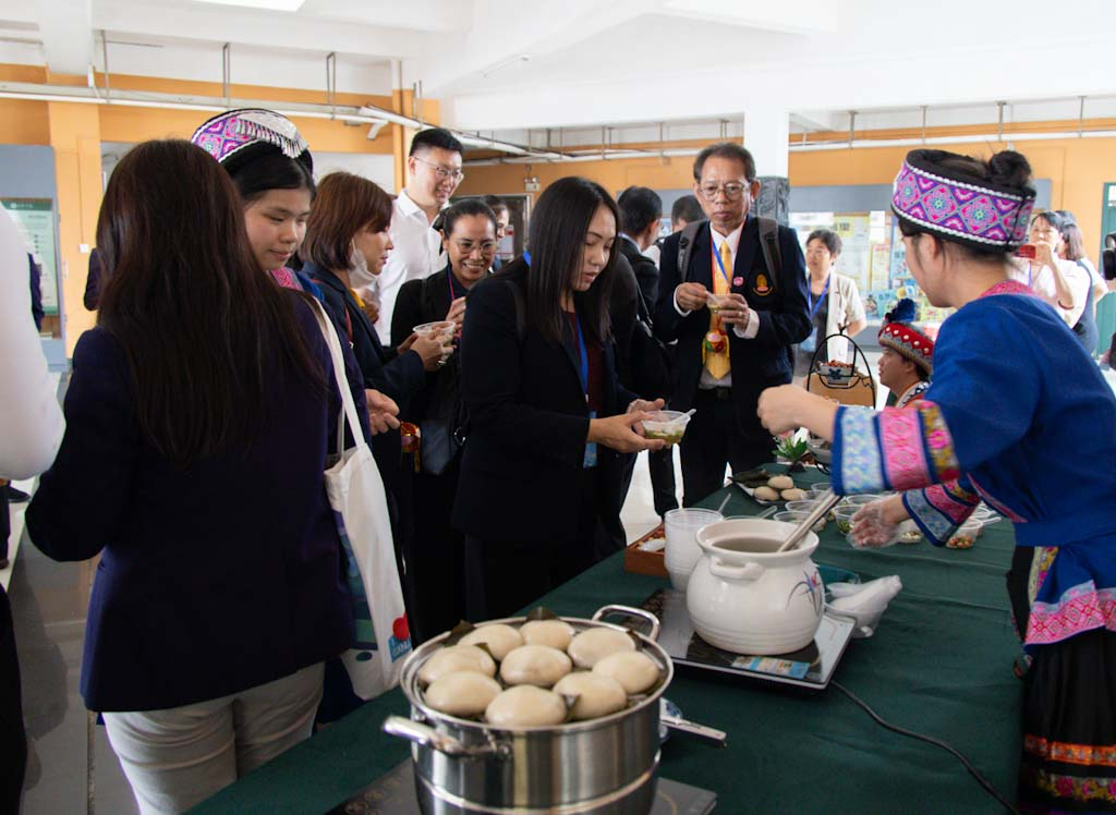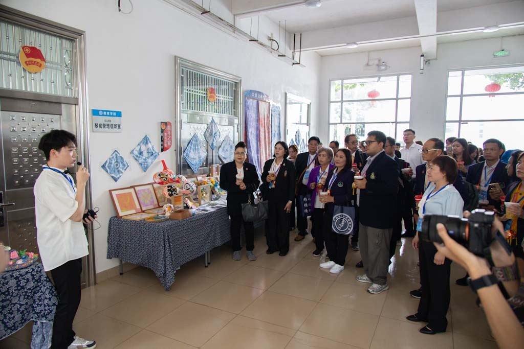 在实地参观环节,在学生志愿者团队熟练的英语、越南语、泰语引导下,外宾观看了体育教育师生准备的舞狮表演,武术社团表演的太极拳,音乐学和舞蹈学师生呈现的古典舞《秋月花舞》、唢呐演奏《庆胜利》以及泰语专业学生深情演唱的泰国传统歌曲《第三恩情》,参与了学前教育专业、向阳花文意盎然工作室、半步斎书画社等师生团队精心设置的古筝演奏、油茶制作、蜡染、缠花、刻纸、书法等沉浸式体验项目。中华优秀传统文化体验感受深厚底蕴,威武灵动的舞狮表演点燃现场气氛,典雅优美的中国古典舞展现东方美学,刚柔并济的太极拳传递哲学智慧,高亢激昂的唢呐独奏尽显民族风情,让外宾们流连忘返,纷纷竖起大拇指夸道:“Amazing(惊艳)”。