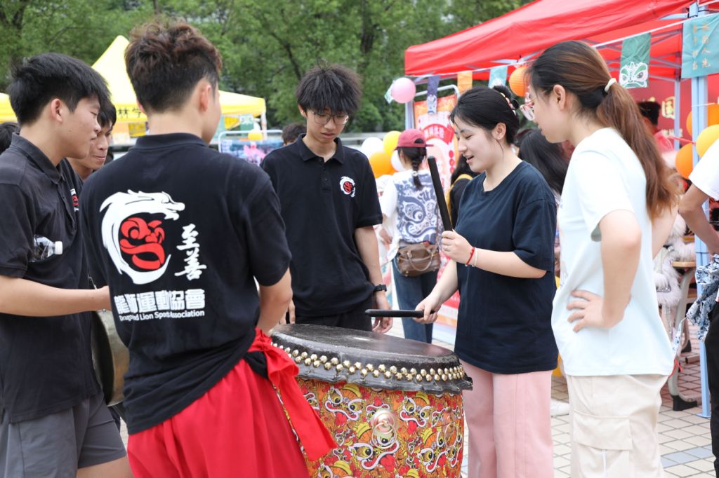 活动现场设置了6个互动体验区,涵盖“舞狮”“锣鼓镲”“彩带龙”等传统文化项目。在“舞狮”体验区,同学们学习了舞狮的摇头摆尾、跳跃等基本步伐动作,体验狮子的灵动与威武;“锣鼓镲”体验区,同学们通过学习锣鼓镲的基本演奏技巧,感受传统器乐在龙狮表演中营造的热烈氛围;知识问答区,同学们踊跃参与,通过回答有关龙狮文化的知识问题,进一步加深对中华优秀传统文化的认知与理解。