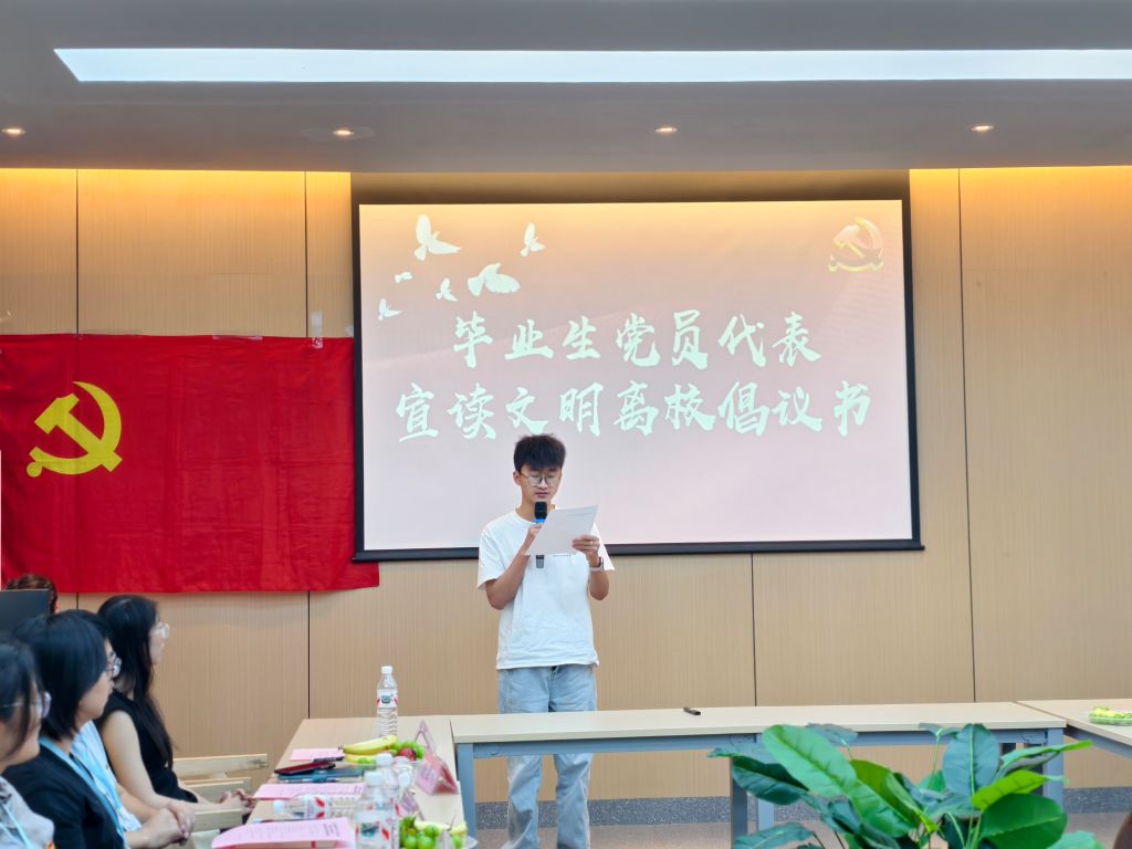 一段成长视频《青春向党・砥砺前行》为欢送仪式拉开仪式序幕。28名毕业生党员依次分享思想蜕变,学生党员王友林感慨:“党员身份不仅是荣誉,更是责任担当。”随后,赵度稳代表全体毕业生宣读《文明离校倡议书》,与会党员在倡议横幅签名承诺。