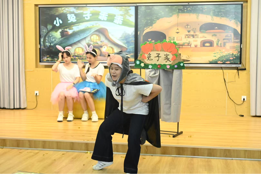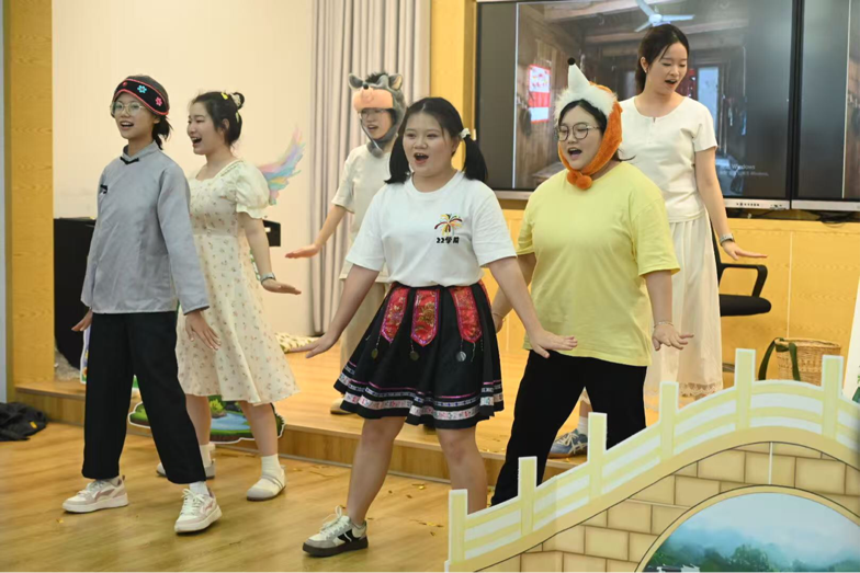 活动于6月25日下午3点在6345教室(学前音乐教育活动实训室)拉开帷幕。作为校级“专创”融合示范课程《奥尔夫儿童音乐活动》建设的重要实践成果,16个绘本奥尔夫音乐剧依次登台。其中,学生团队原创剧本《摇妹新冒险》脱颖而出,成为全场焦点。该剧以桂林童谣为蓝本,围绕“爱与成长”主线,讲述主人公摇妹勇敢担起家庭责任、传递爱与勇气的故事。创作团队巧妙提炼传统童谣中“孝亲”“担当”等核心理念,将象鼻山、漓江等桂林标志性山水风光,以及桂林米粉等特色饮食文化融入戏剧情节,通过“童谣 + 地域文化 + 音乐戏剧”的立体化教育模式,让古老的八桂文化以生动鲜活的形式重焕光彩,也为学前教育专业艺术类课程思政建设提供了创新范例。
