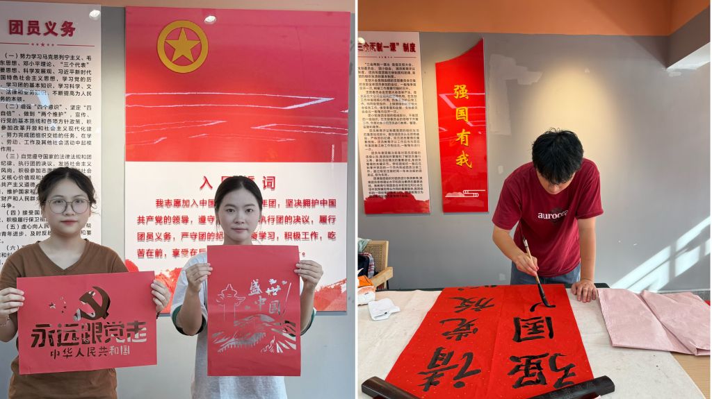 活动现场,传统艺术与时代主题交相辉映,营造出浓厚的氛围。手工DIY环保协会的同学们将版刻艺术与活动主题相结合,将红纸化为精美的党徽、长城等图案,方寸之间凝聚着对党的深情祝福。半步斋书画社的同学们则挥毫泼墨,“请党放心 强国有我”“青春心向党 奋进新征程”等遒劲有力的大字跃然纸上,墨香中流淌着年轻一代为实现中华民族伟大复兴的中国梦贡献力量的意愿。