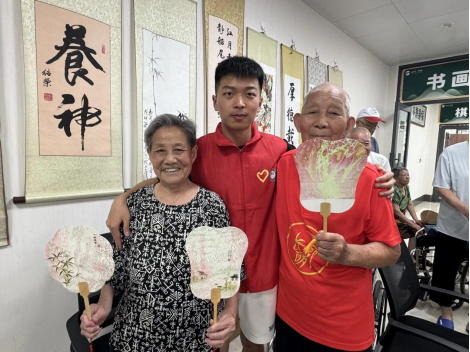 为化解老人的精神孤寂,团队创新性设计“临时孙辈”角色,开展“故事换物”温情互动——青年学子们一对一倾听老人们的人生故事、珍贵的抗战记忆,用心采集生命历程,并回赠亲手制作的艾草安神枕,传递关怀与慰藉。此外,共同制作蕴含地方特色的漓江主题非遗漆扇、安神香囊,以及组织《我和我的祖国》等红歌合唱与太极互动教学,成为打破代际隔阂、促进心灵共鸣的生动桥梁。九旬老人在熟悉旋律中轻晃轮椅打拍的画面,正是情感交融的最佳注脚。