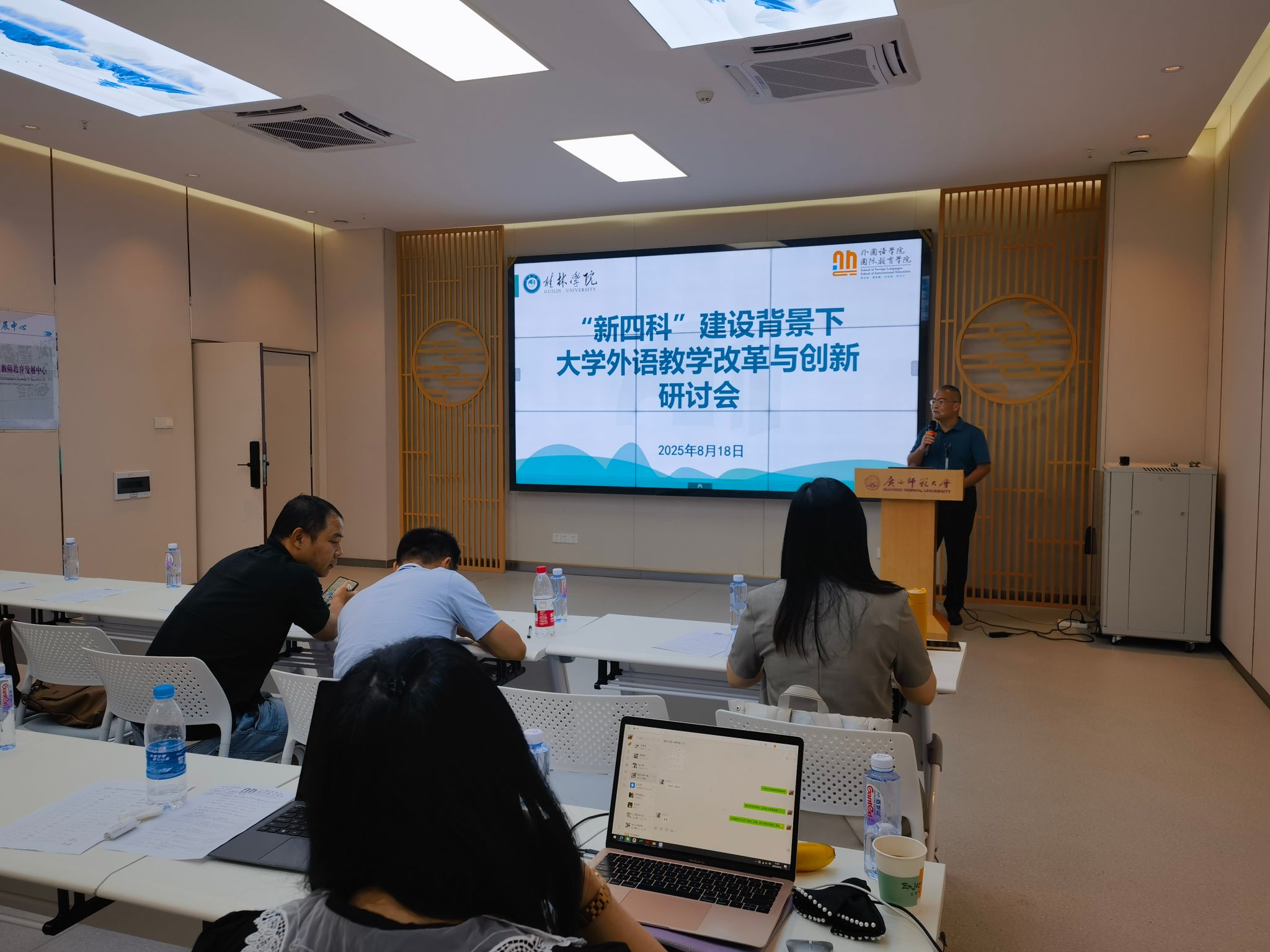 8月18日上午,外国语学院在广西师范大学育才校区国教中心举行“‘新四科’建设背景下大学外语教学改革与创新研讨会”。大学外语全体教师及特邀嘉宾齐聚一堂,共同探索人工智能时代外语教学的改革方向与实践路径,会议由学院副院长主持。