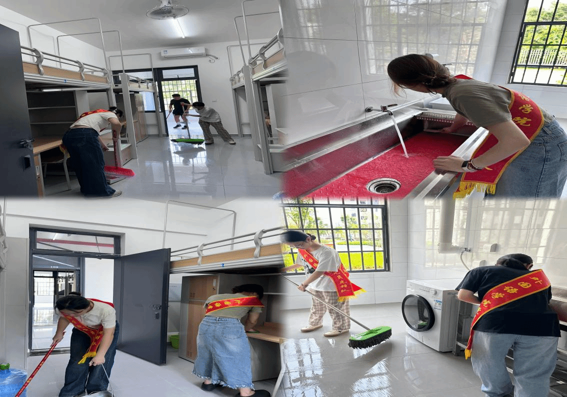 在党支部书记黄幸津老师的带领下,大家充分发扬不怕脏、不怕累的精神,分工明确,密切配合。从桌椅的擦拭到储物柜的整理,从地面的清扫到卫生间的消毒,志愿者们对每一个角落都进行了细致入微的清洁。同时,他们还仔细检查了水电设施、门窗锁具、照明开关等基础设施,确保宿舍安全无隐患、生活设施正常使用,为新生打造一个舒适、安心的居住环境。