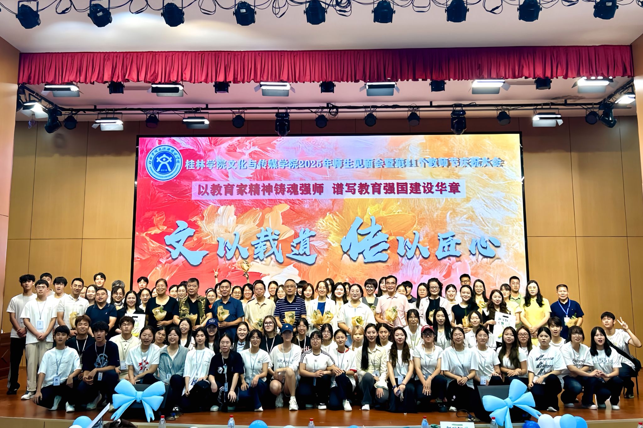 9月10日下午,文化与传媒学院“文以载道,传以匠心”——2025年师生见面会暨第41个教师节庆祝大会在桂林市金雁学校隆重举行。学院领导班子、全体教师、2025级新生及军训教官齐聚一堂,共庆教师节,同启大学新征程。
