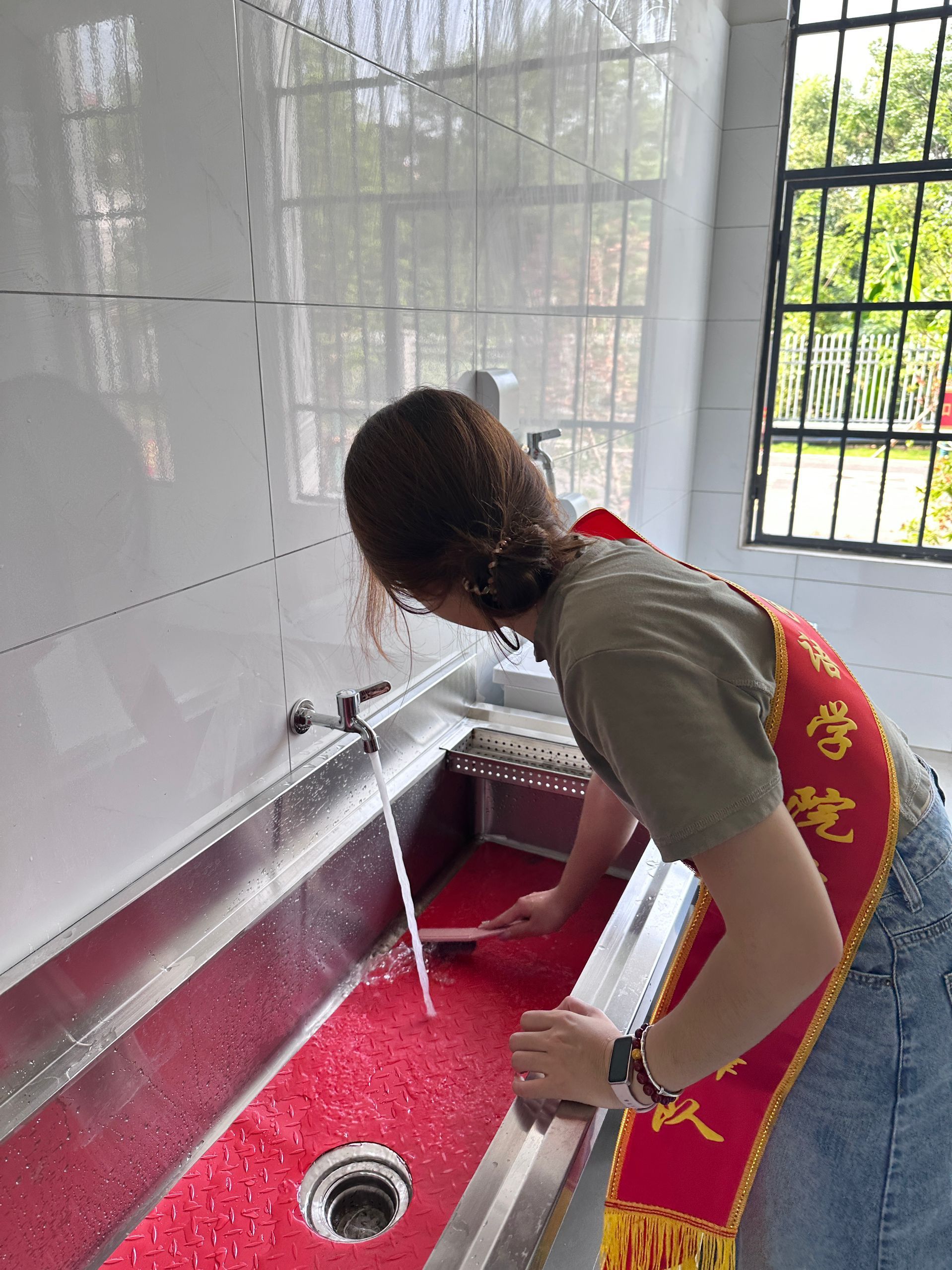图为外国语学院学生志愿者为新生清扫宿舍卫生