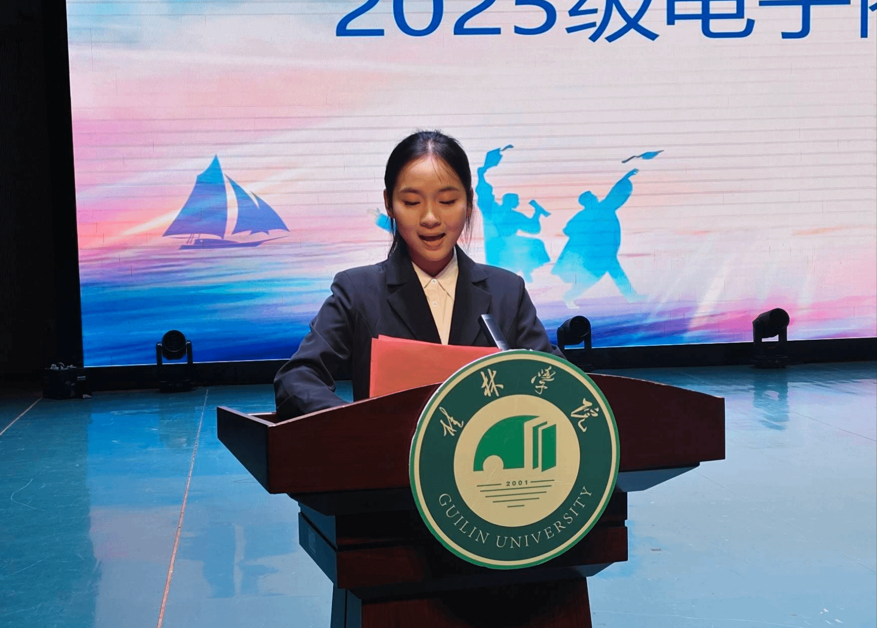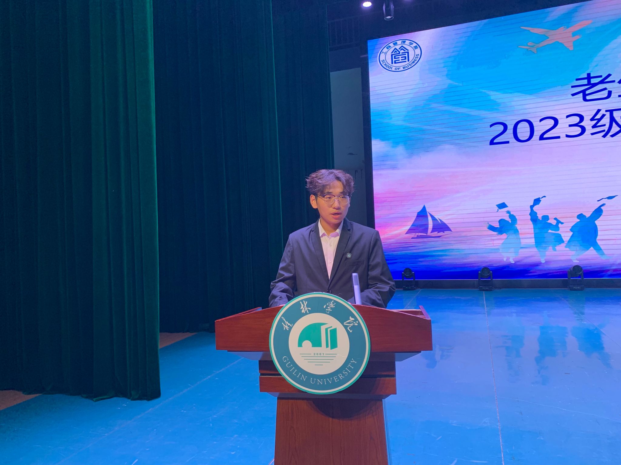 新生辅导员代表吴东艳发言,她希望新生们珍惜大学时光,勇于迎接挑战,在磨砺中不断成长。教师代表张莉则寄语新生,期盼每位同学都能在桂林学院找到适合自己的发展道路,书写精彩的人生篇章。老生代表王帅结合自身经历,分享了大学的收获与感悟,并向学弟学妹们传递了美好的祝愿。新生代表郑丽霞表达了初入大学的感受与对未来生活的憧憬,展现了立志拼搏、开创未来的坚定决心。
