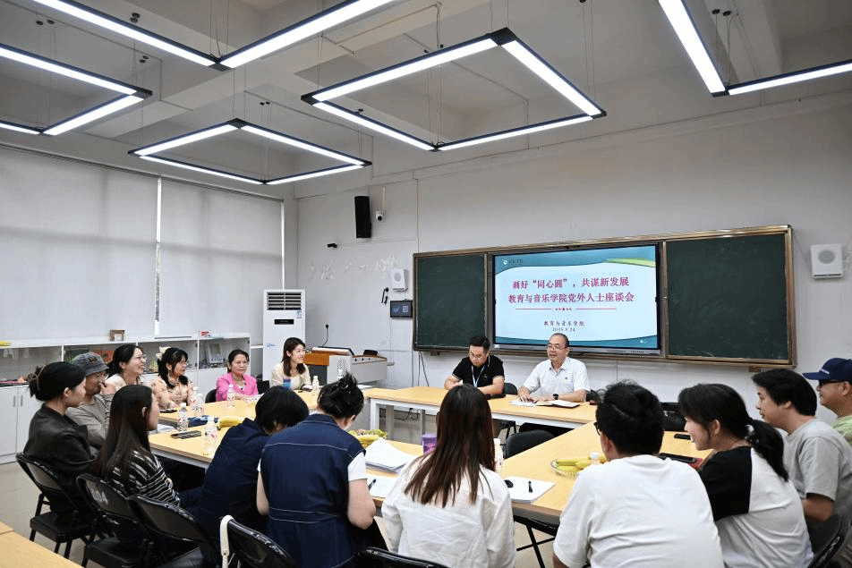 为凝聚发展共识,汇聚奋进力量,9月24日,教育与音乐学院党总支在嘉善楼6242实训室召开主题为“画好同心圆 共谋新发展”的党外人士座谈会。学院党总支书记、副书记与各专业教研室的党外教师代表齐聚一堂,倾听心声、共话发展。