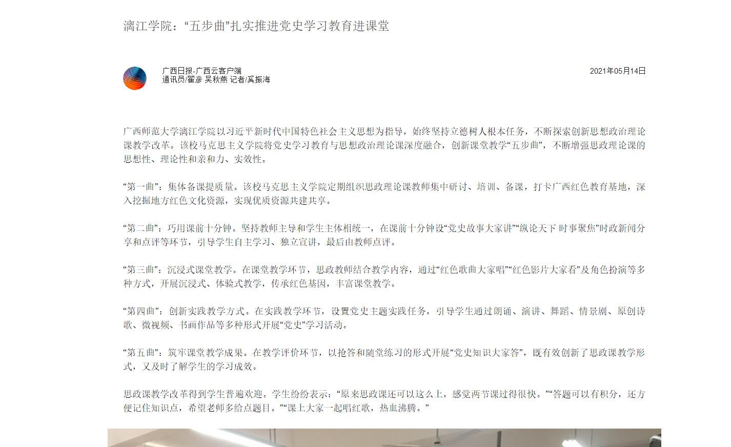 广西师范大学漓江学院以习近平新时代中国特色社会主义思想为指导,始终坚持立德树人根本任务,不断探索创新思想政治理论课教学改革。该校马克思主义学院将党史学习教育与思想政治理论课深度融合,创新课堂教学“五步曲”,不断增强思政理论课的思想性、理论性和亲和力、实效性。