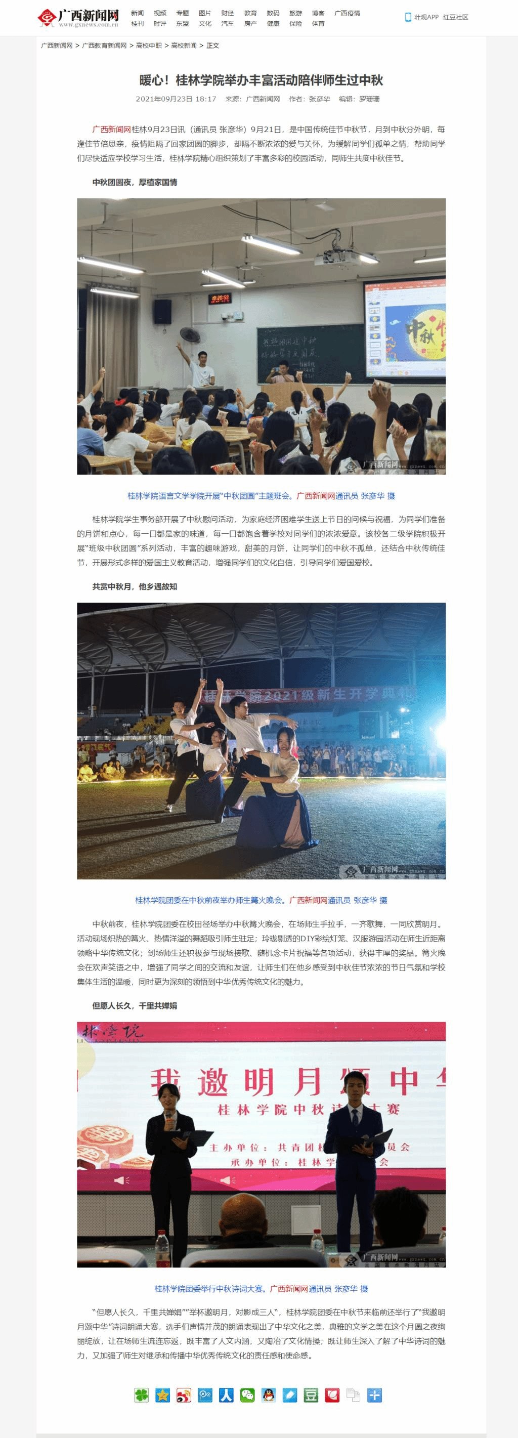 9月23日,广西新闻网以《暖心!桂林学院举办丰富活动陪伴师生过中秋》为题,关注报道了我校在中国传统佳节中秋节到来之际精心组织策划丰富多彩的校园活动,同师生共度中秋佳节。