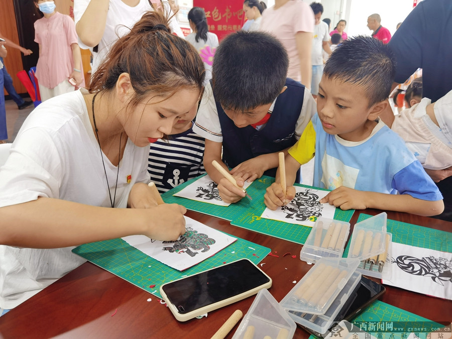 桂林学院汉韵社学生党员在为小朋友做刻字示范。广西新闻网通讯员 农婷美 摄