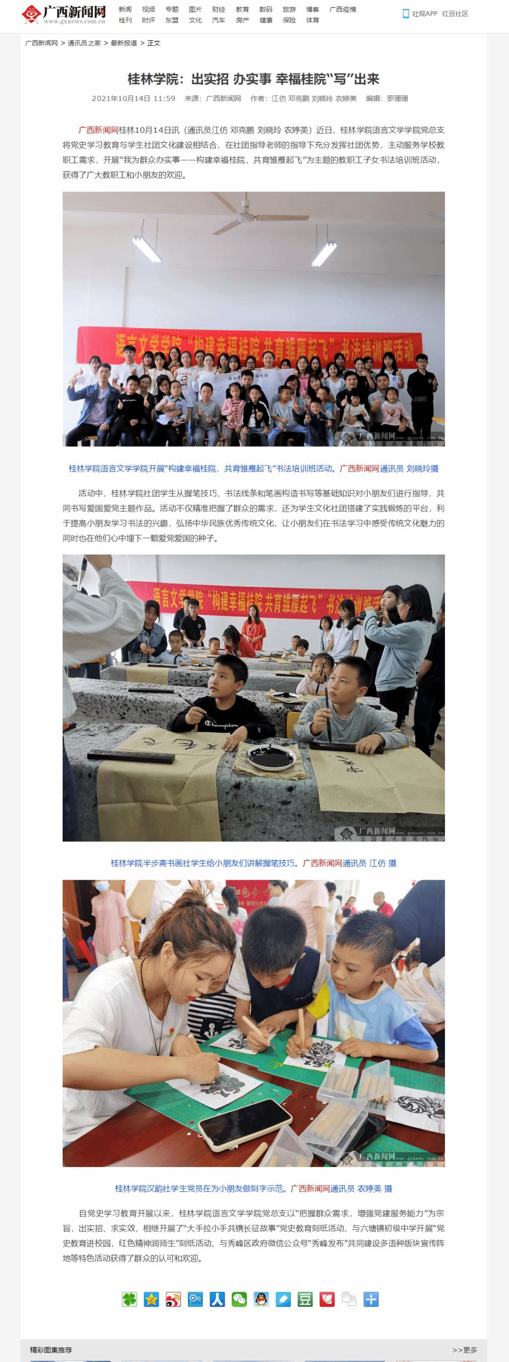 10月14日,广西新闻网以《桂林学院:出实招 办实事 幸福桂院“写”出来》为题,关注报道我校语言文学学院党总支将党史学习教育与学生社团文化建设相结合,在社团指导老师的指导下充分发挥社团优势,主动服务学校教职工需求,开展“我为群众办实事——构建幸福桂院,共育雏雁起飞”为主题的教职工子女书法培训班活动。
