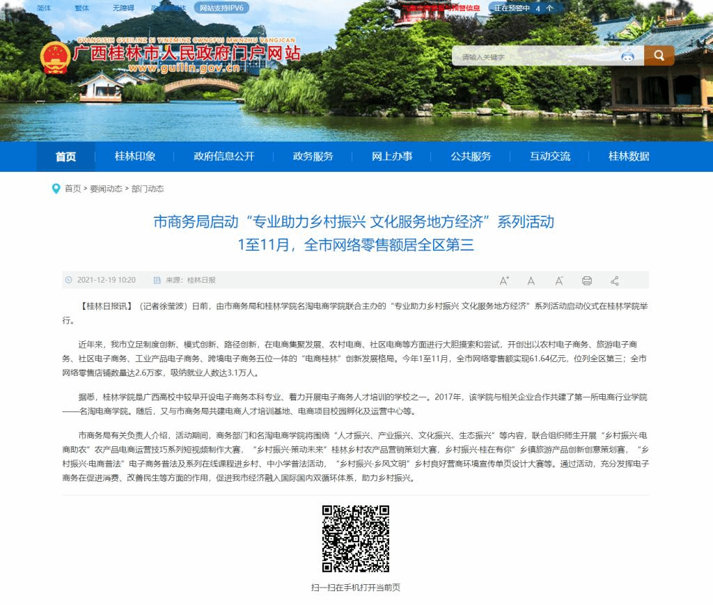 近日,桂林日报以《市商务局启动“专业助力乡村振兴 文化服务地方经济”系列活动1至11月,全市网络零售额居全区第三》为题关注报道了我校名淘电商学院与桂林市商务局联合主办的“专业助力乡村振兴 文化服务地方经济”系列活动。桂林市人民政府门户网站转发了上述新闻报道。