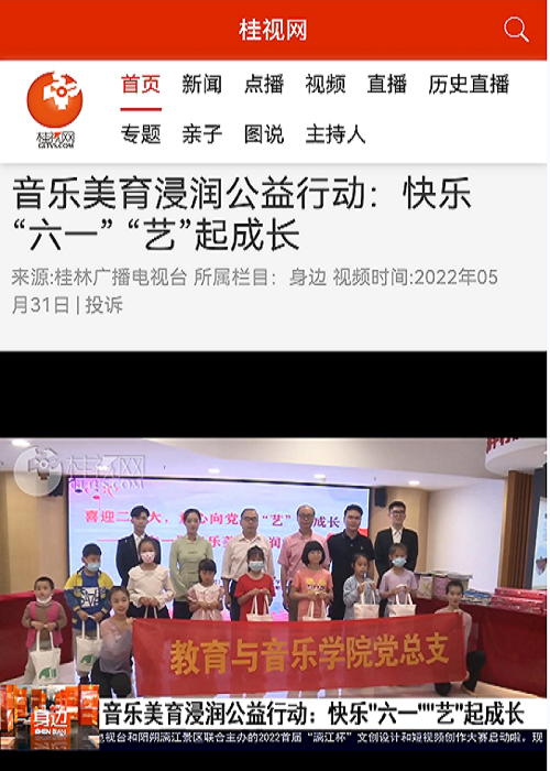 桂林电视台以“音乐美育浸润公益行动:快乐‘六一’,‘艺’起成长”为题,报道了我校教育与音乐学院党总支到穿山街道开展的美育浸润,庆祝六一儿童节的活动。对此次活动的开展给予了很好的评价,师生们深受鼓舞,教育与音乐学院将进一步唱响主旋律、弘扬好作风,更好的服务地方经济社会发展,服务少年儿童成长。